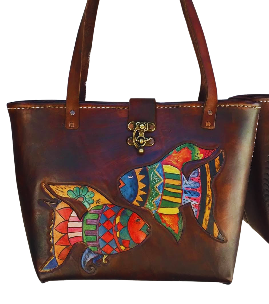 Artisan bag made of genuine dark brown leather. The front showcases two hand-painted fish in vibrant tones of red, blue, green, orange, and yellow. Each fish features unique decorative details that highlight a folkloric and artistic style. The bag includes long leather handles, reinforced stitching, and a decorative antique-style metal clasp. A bold, original accessory full of color and personality.