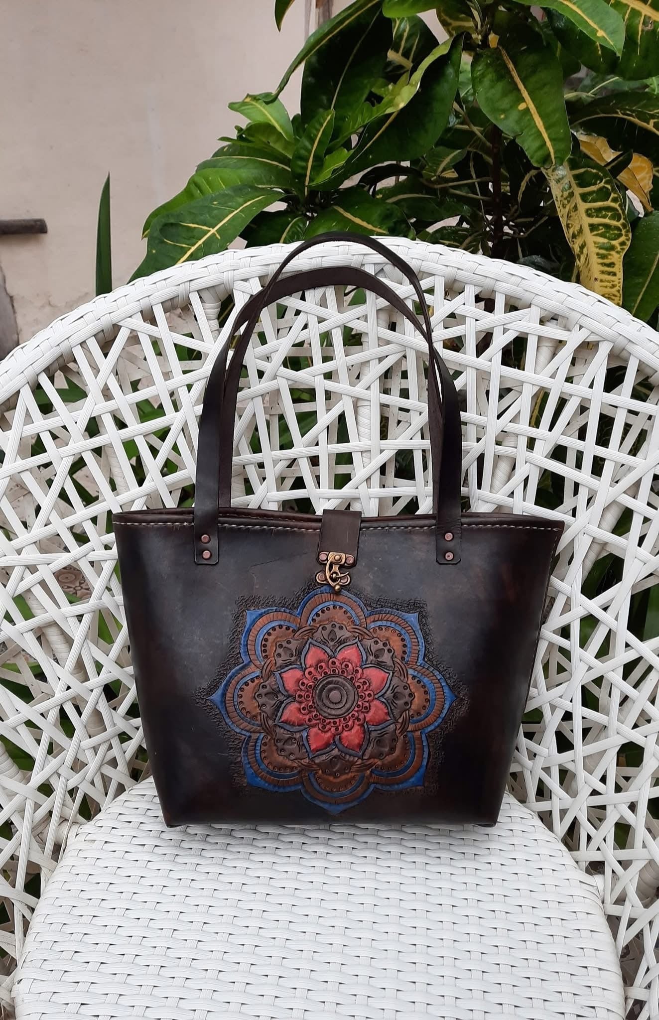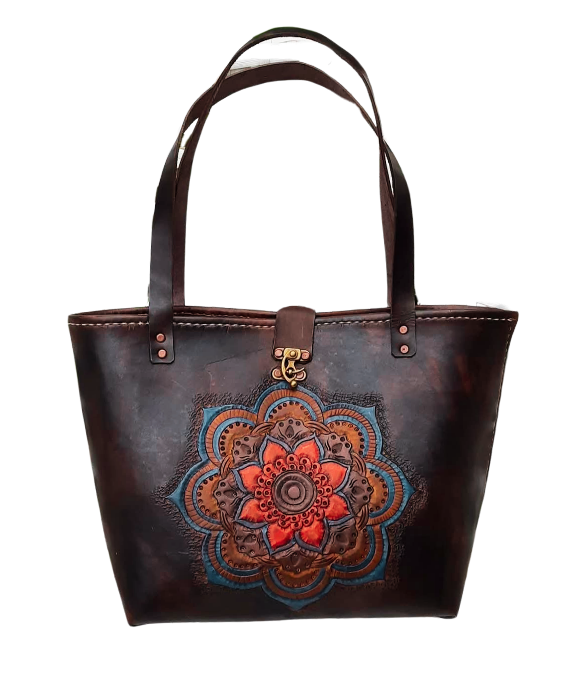 This artisan handbag is crafted from genuine dark brown leather. On the front, a mandala is hand-painted in earthy tones of terracotta, deep red, and blue, adding a warm and elegant touch. It features long leather handles, visible stitching, and a vintage-style brass clasp for secure closure. A perfect accessory for those who appreciate handcrafted pieces with character and charm.